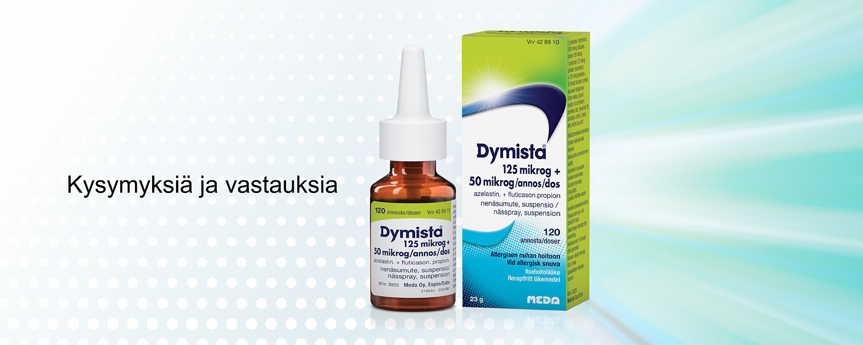 Dymista on 2 in 1 -tuote, jossa on kaksi eri lääkeainetta, antihistamiini ja kortisoni, yhdessä valmisteessa. Dymistan vaikuttavien aineiden yhdistelmä on tutkitusti tehokkaampi apu allergiseen nuhaan kuin pelkkää kortisonia sisältävä nenäsumute. Dymista lievittää allergisia nenäoireita vain 5 minuutin kuluessa lääkkeen otosta. Dymistan on todettu olevan avuksi myös allergisiin silmäoireisiin*.